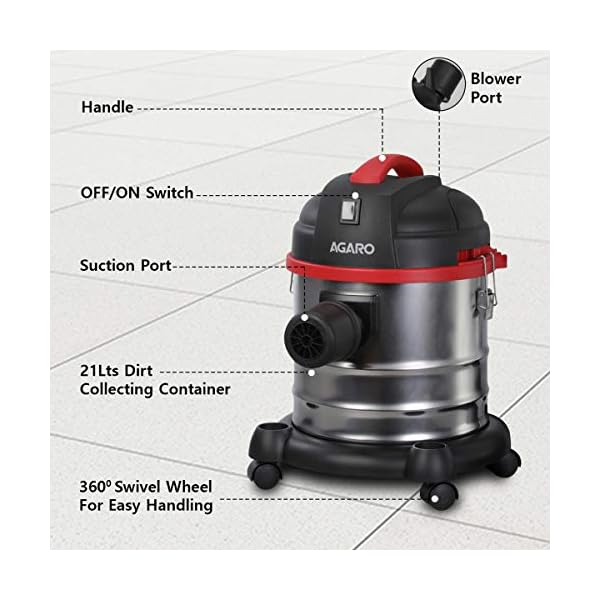 AGARO Ace 1600 Watts, 21.5 kPa Suction Power, 21 litres Wet & Dry Stainless Steel Vacuum Cleaner with Blower Function…