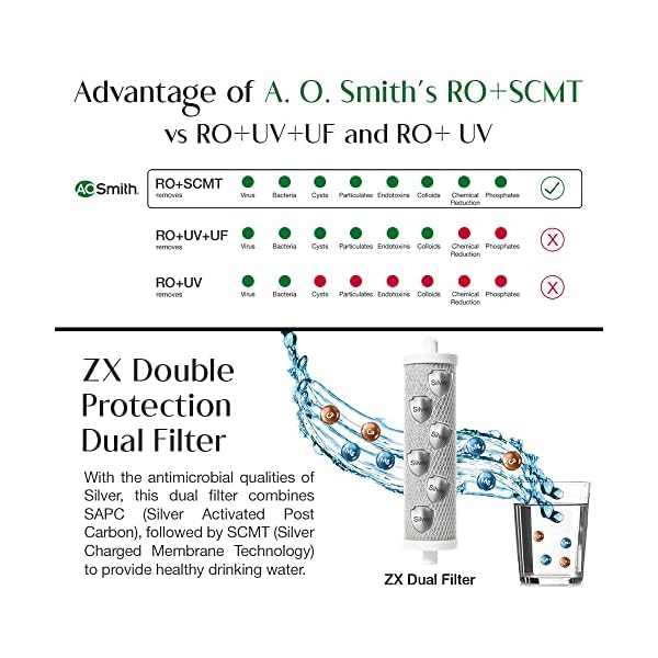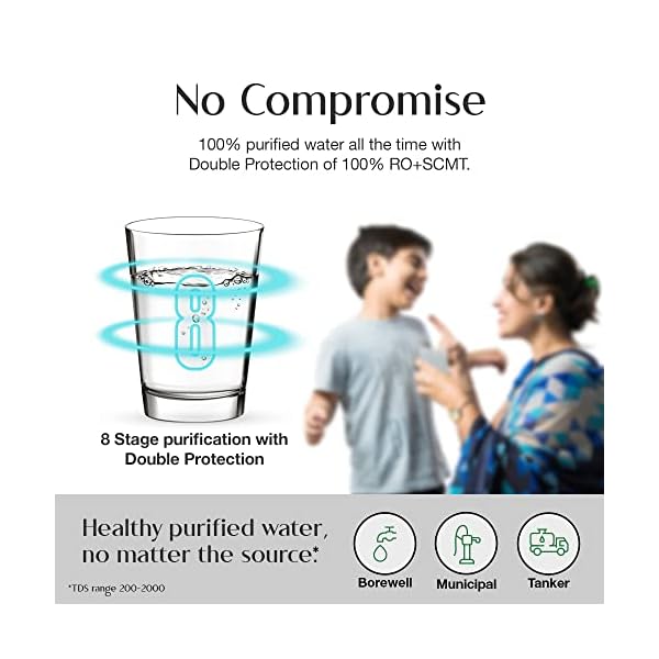 Baby Safe water with 8 Stages of Purification Technology – 1)Pre-filter 2) Sediment filter 3) ART MAX (Advance Recovery Technology) 4) SCB filter + 5) Side Stream RO membrane + 6) Alkaline Min-Tech + ZX Double Protection Dual Filter ( 7) Post Carbon block +8) SCMT).;Suitable for mixed sources of water- municipal, tanker and borewell water for TDS 200-2000