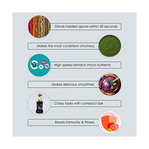Powerful Motor:The compact yet powerful machine grinds the toughest of chutneys and masalas, and ensures nutrition extraction from all fruits and veggies thanks to its incredibly high speed of 22,000 RPM, which is almost twice that of normal mixer-grinders